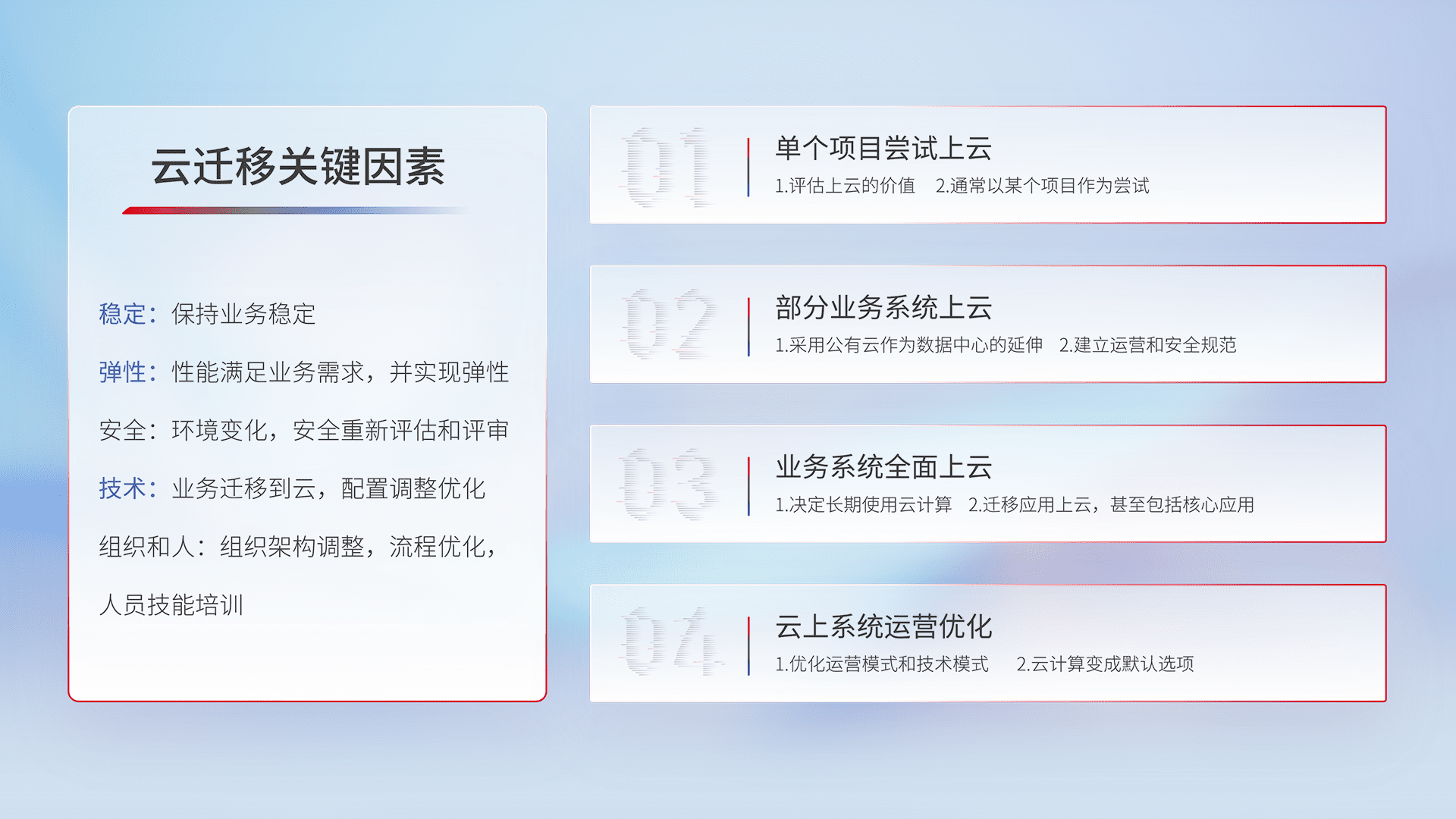 结合实际业务,,从规划设计、、、、云平台选型、、云原生改造、、、、数据迁移、、、集成交付,,,,迁移全过程为客户识别最佳上云路径,,,,做好风险识别管理,,,,设计网络架构、、、身份权限、、、、安全审计合规、、、操作审计、、日志审计、、监控告警策略、、多站点容灾设计等,,,对云上基础设施进行整体规划,,提升IT治理水平,,,,以满足弹性、、、高可用、、、、高性能的需求。。