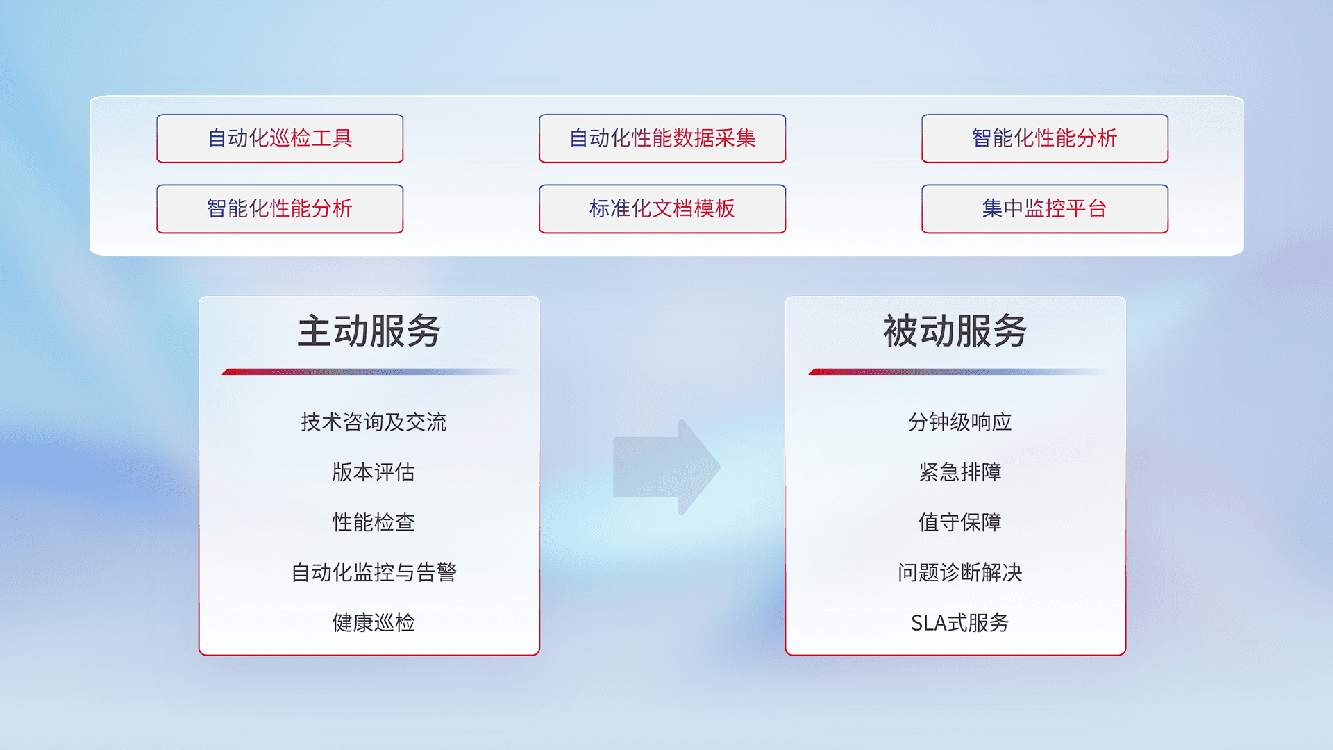 智能化工具和标准化文档,,保障服务质量,,提供主动服务(包含技术咨询、、、、版本评估、、性能检查、、、、自动化监控与告警、、健康巡检)和被动服务包含(分钟级响应、、、、紧急排障、、、、值守保障、、问题诊断解决、、SLA服务)。。。